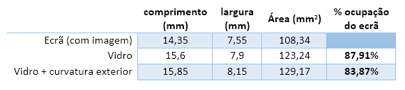 Na verdade, em termos de modelo de design, é ocupada realmente uma área de 91,3%, mas não foi isso que foi produzido. É facilmente percetível que, na zona onde a moldura é mais fina, no modelo gráfico a moldura é quase inexistente e na realidade tem cerca de 2 mm.