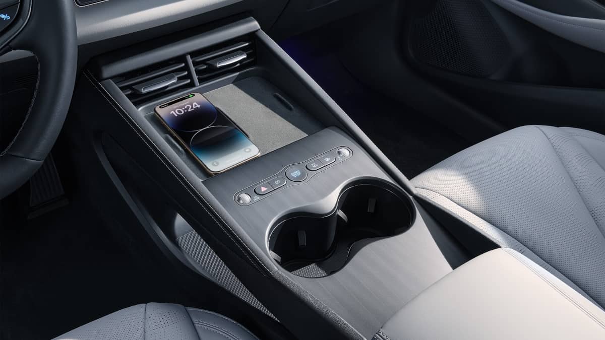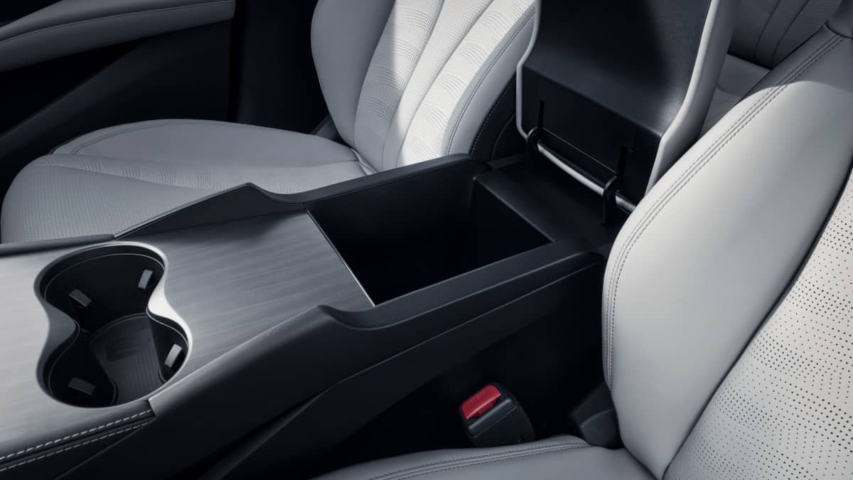 Depois, o centro do tablier é ocupado por um ecrã de infoentretenimento de alta resolução (12,8″ ou 15,6″, conforme versão). Todos os ocupantes têm acesso a alimentação elétrica: duas portas USB-C na frente (18 W e 60 W) e duas USB-C de 18 W na traseira. As duas versões incluem ainda um carregador sem fios para smartphones de 50 W.